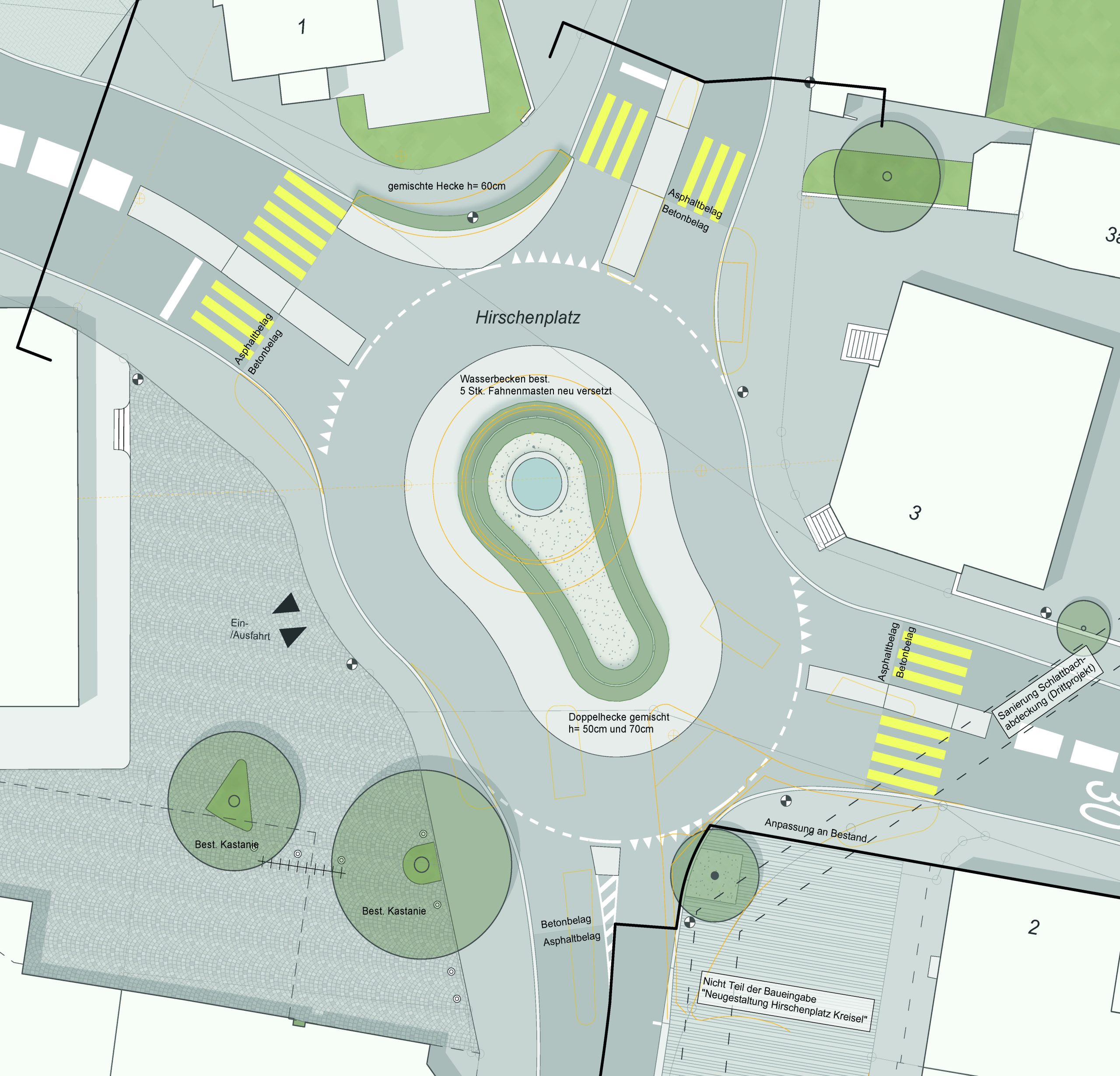 Im Rahmen des notwendigen Baubewilligungsverfahrens wurden drei Einsprachen eingereicht. Diese betreffen die Themen Aufhebung der Fussgängerstreifen, die Beibehaltung von Parkplätzen im Bereich des Kreisels und die Entfernung der ausgeschiedenen Baufelder für fixe Imbissstände. Teilweise konnten die Einsprachen im Rahmen der Einigungsverhandlung bereinigt werden. Eine Einsprache blieb aufrechterhalten. Um das Gesamtprojekt Marktplatz zügig fortsetzen zu können, hat der GR das Projekt im Bereich des Hirschenkreisels angepasst. Er macht damit von der Möglichkeit im GGR-Beschluss Gebrauch, dass der GR notwendige und zweckmässige Projektänderungen vornehmen kann, wenn damit der Gesamtcharakter des Projektes nicht verändert wird. Die letzten rund 20 Meter des Marktplatzes werden somit im Rahmen der laufenden Bauarbeiten nicht verändert.